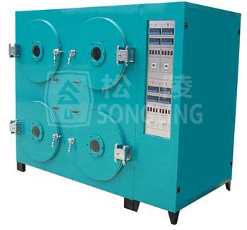 本真空干燥箱是松陵電器研究、開發的專用于電池極片烘烤的新產品。真空室為圓筒形,便于電池極片整卷裝載,在真空狀態下烘烤。多個真空室組合成一個整體,結構緊湊,節省工作場地;配置一臺真空泵抽真空,多個真空室分別控制加熱,獨立工作,靈活方便。同時,抽真空系統采用數顯真空計,自動控制真空度的上下限。真空室的外部和中軸均設置有加熱裝置,并分別配置高精度溫控儀控溫。真空室圓門的中間設置圓形觀察窗。產品投放市場后,受到了電池極片生產廠家及相關用戶的好評。